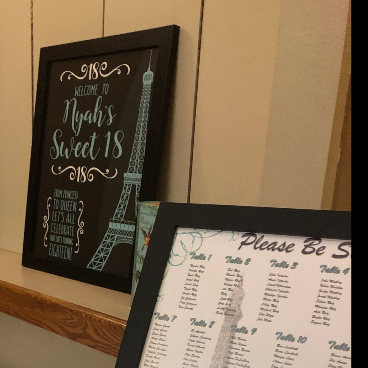 Welcome to the Sweet 16 Party printable black background sign with a Paris theme!