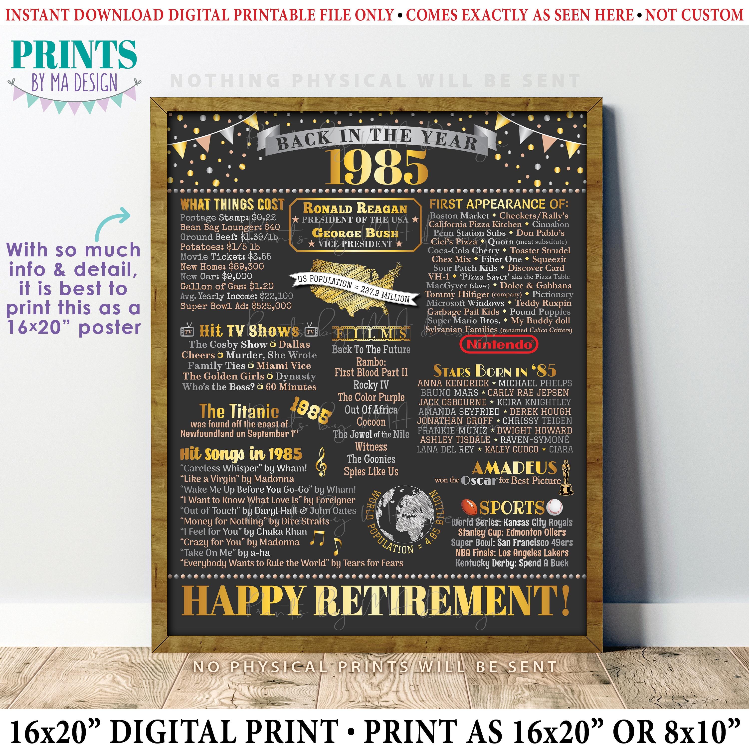 Flashback to 1985 printable dark gray/chalkboard style poster. A fun poster filled with facts, events, and tidbits from the USA in 1985. Makes an excellent gift or party decoration!