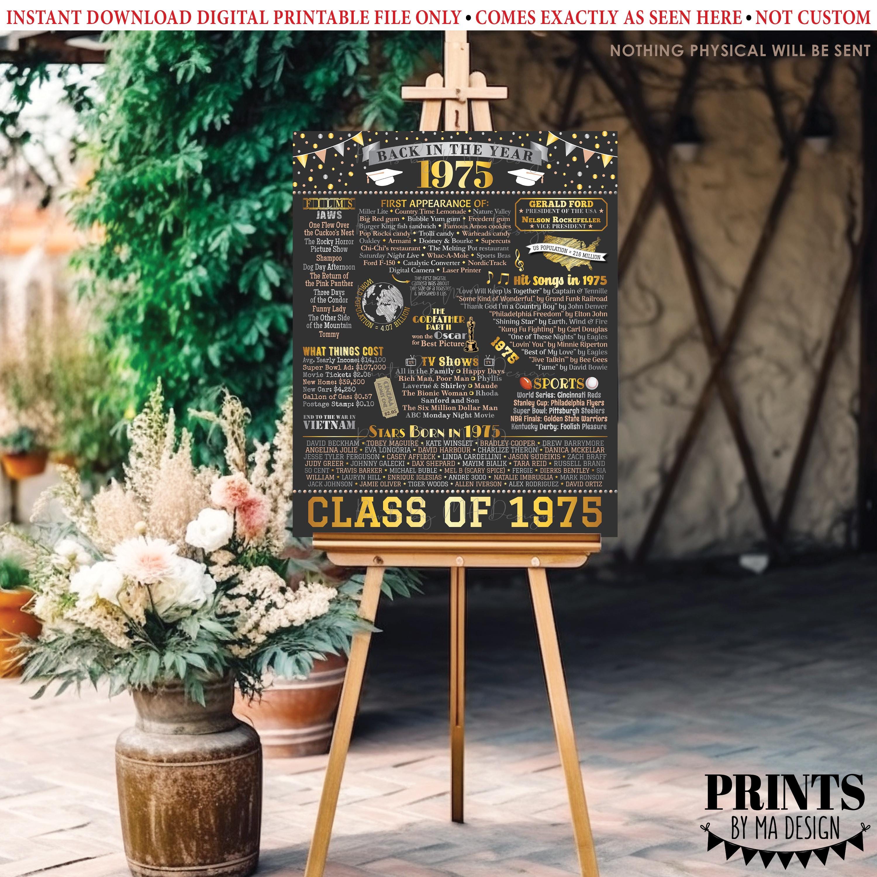 Flashback to 1975 printable dark gray/chalkboard style poster. A fun poster filled with facts, events, and tidbits from the USA in 1975. Makes an excellent gift or party decoration!