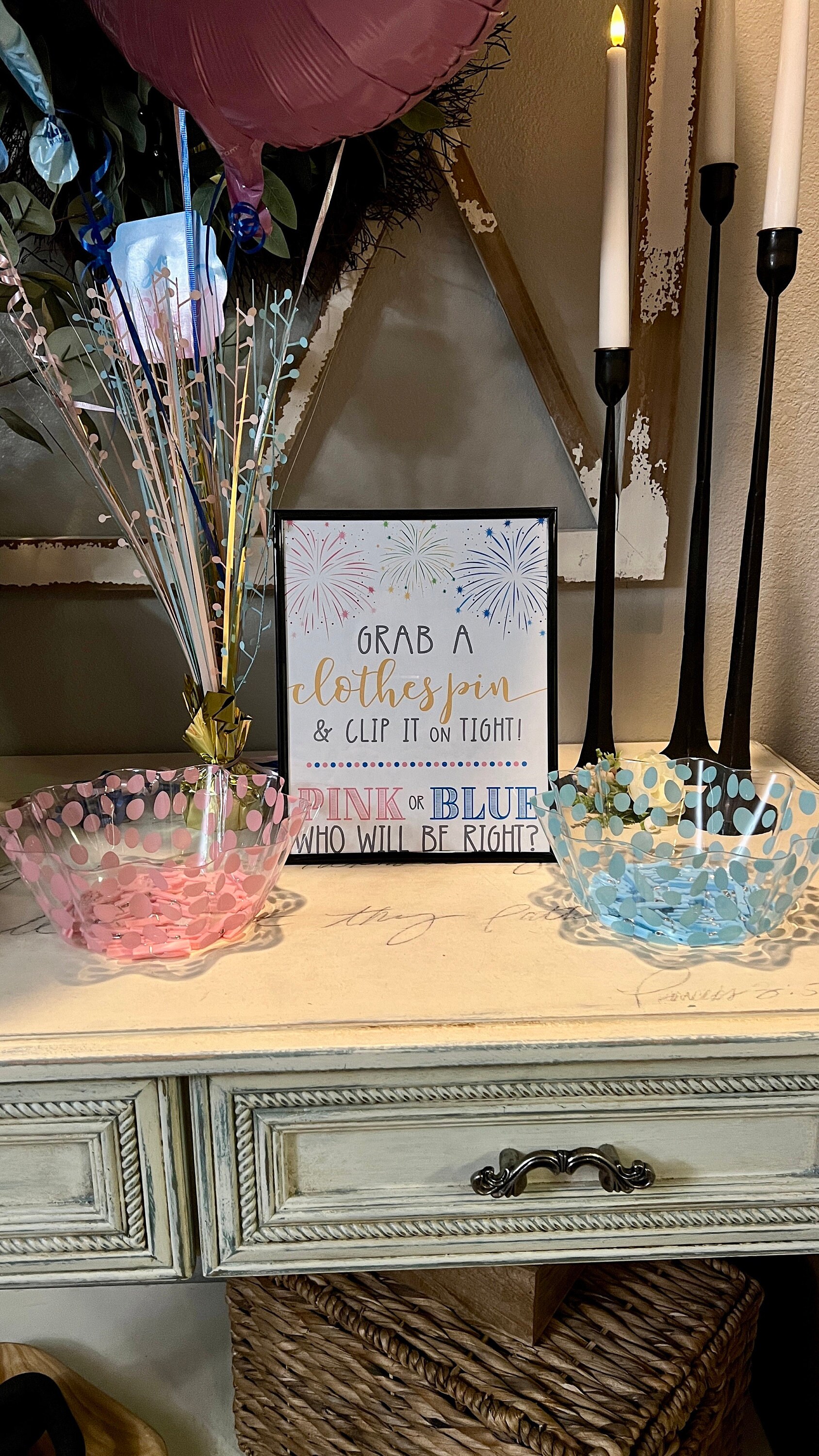 Printable fireworks themed gender reveal party sign! Grab a clothes pin and clip it on tight! Pink or Blue, who will be right?