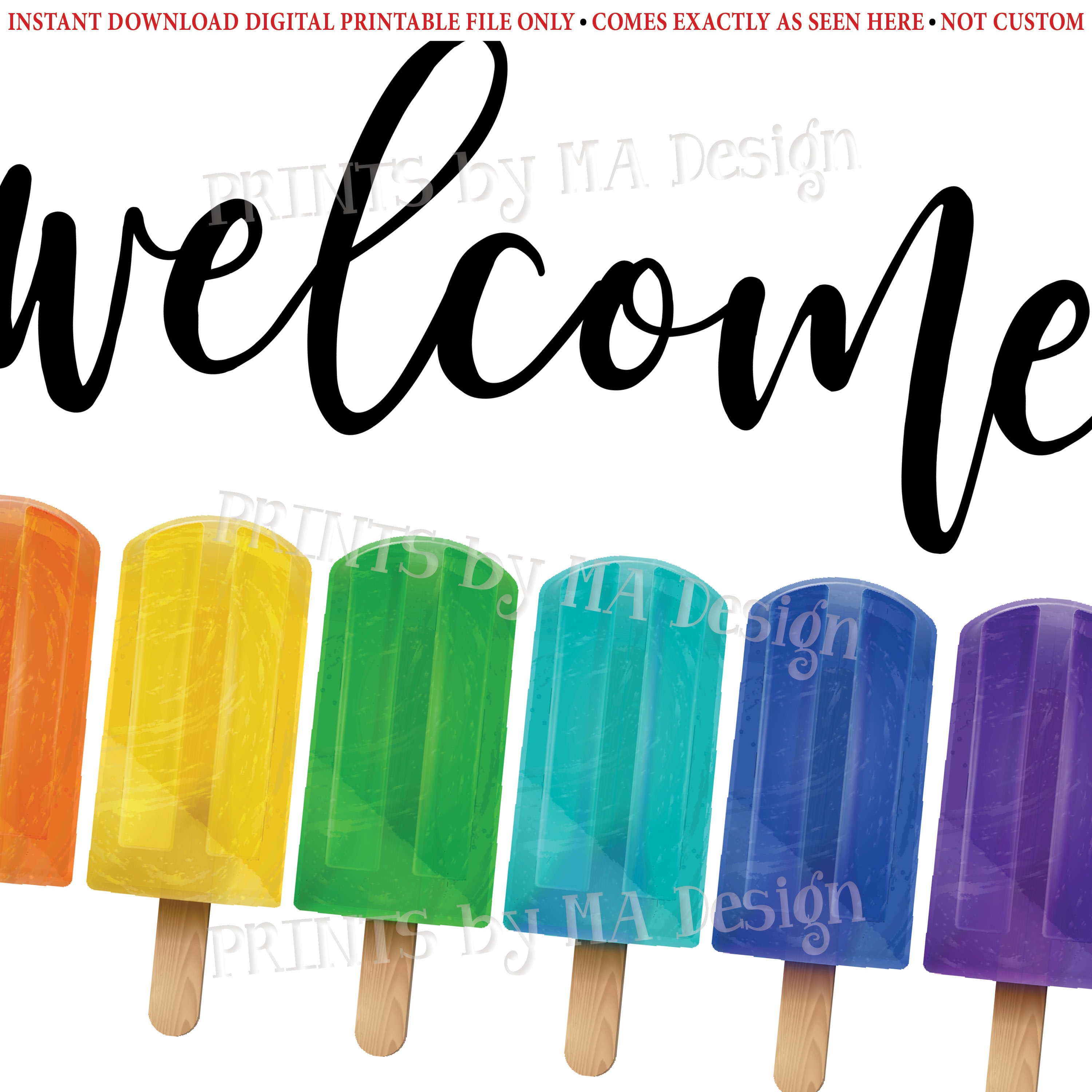 Printable "Welcome" sign with colorful frozen ice pop dessert graphics.